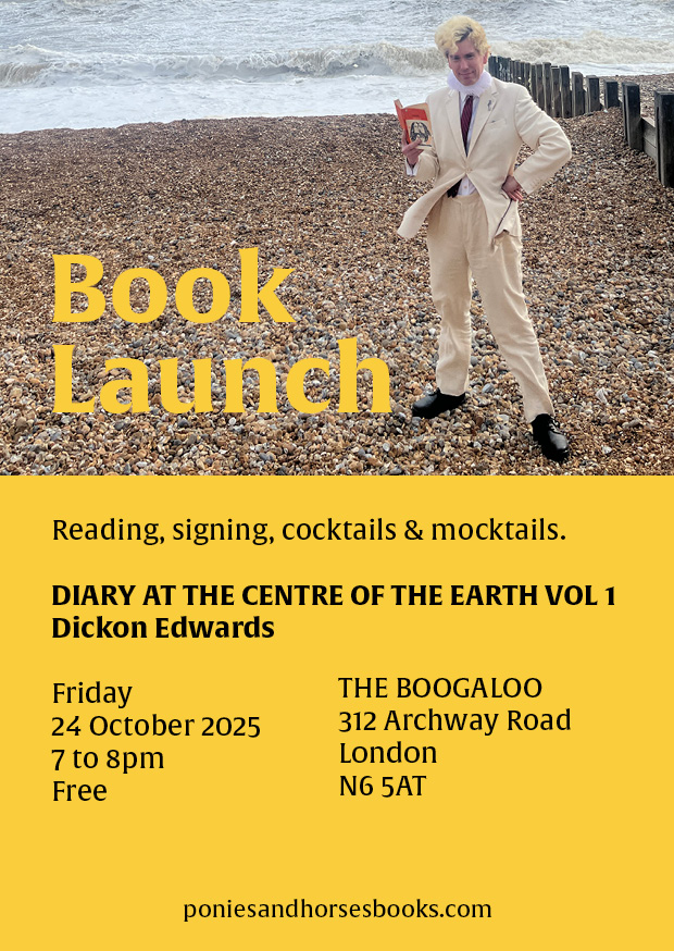 To celebrate our first print edition of Dickon Edwards’ notable diaries, please come to The Boogaloo, Archway, at 7pm on Friday 24th October (after the Small Publishers Bookfair).